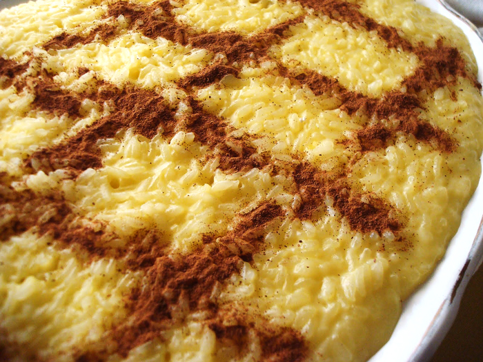 Pesam-se as coisas. Num tacho bem cheio de água põe-se ao lume, noutro tacho põe-se o litro de leite com a casca de limão e o pau de canela e o açúcar. Quando o tacho com água começar a ferver deita-se o arroz mexe-se e fica a coser durante 20 minutos. Logo que se deita o arroz para o tacho acende-se o lume para o tacho com o leite, açúcar, pau de canela e casca de limão. Lume brando com cuidado para não transbordar mas estar a ferver ao fim dos 20 minutos. Então tira-se do lume o tacho com o arroz e escore-se a água que está a mais. Volta ao lume e vai-se acrescentando aos poucos a mistura de leite. Não é conveniente virar as costas há que mexer até ficar com um creme com uma consistência que não pode ser seca nem demasiado liquida. Quase no fim , junta-se as gemas batidas com um pouco de leite numa taça para onde se deitou um pouco do arroz – para aquecer as gemas e assim ao mistura-las com o arroz não talharem- acrescenta-se o resto e mistura-se uma vez e está pronto. Deita-se ainda quente em tigelas e quando estiver frio decora-se com canela.